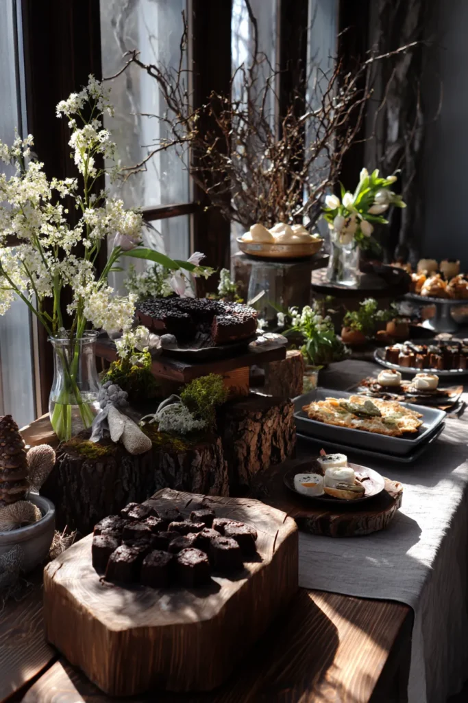 This incredible dessert table is styled to feel like an enchanting woodland scene, using thick, natural wood stumps and logs of various heights as serving platters and risers. The spread features dark chocolate mini-cakes or brownies, small cheese appetizers, and perhaps some meringues, all displayed artfully. White, delicate spring blossoms and sprigs of green moss are tucked in between the food elements, adding pops of freshness to the dark wood and subdued lighting.