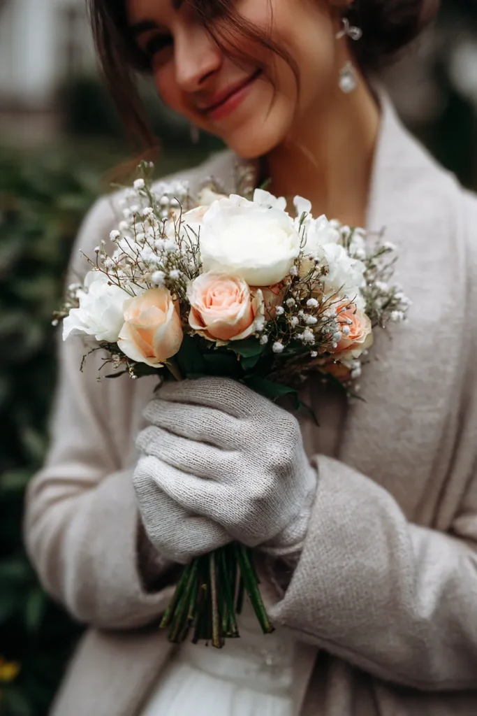 I think this look is absolutely perfect inspiration for a March bride who needs a little warmth but still wants to look incredibly romantic. Layering that soft, textured coat and those sweet gloves over her gown keeps her comfortable while adding a layer of effortless chic. The soft pastel flowers pop beautifully against the neutral outerwear, creating a look that is both gentle and totally stylish for the early spring weather.