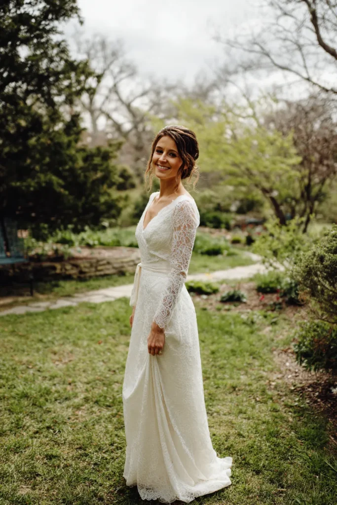 This lovely bride is pictured outdoors in a garden setting where the trees are just starting to show hints of green against a bright, slightly overcast sky. She is wearing a beautiful ivory gown featuring full-length sleeves made entirely of delicate lace, a flattering V-neckline, and a cinched waist tied with a simple fabric sash. Her hair is styled in a soft, voluminous updo with soft tendrils framing her face.