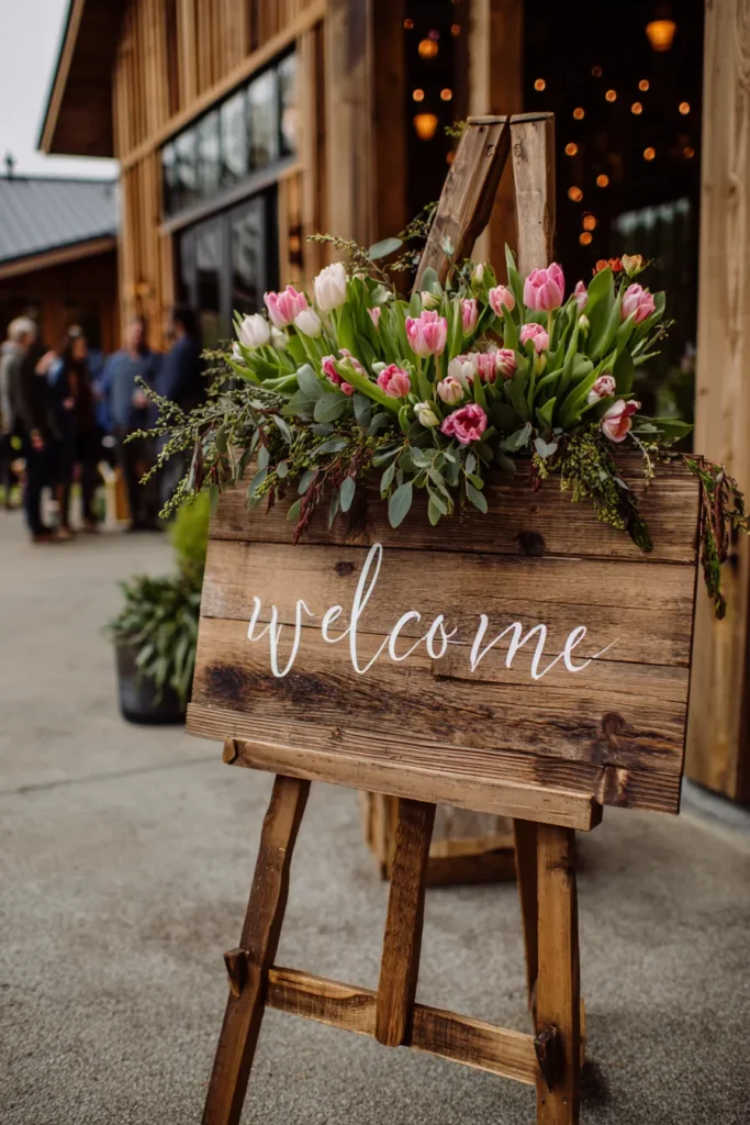 I think this welcome sign is just the perfect blend of rustic charm and vibrant spring elegance. I absolutely adore the use of fresh tulips because they are so distinctly spring-like and add a beautiful pop of color against the natural wood and greenery. It’s such a clever way to set a warm, inviting, and cheerful tone the moment guests arrive at the venue. This design feels incredibly charming and is definitely a winner if you are planning a welcoming and naturally beautiful wedding celebration.