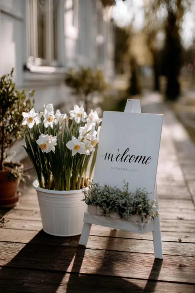 I absolutely adore how simple yet incredibly effective this design is because the daffodils immediately announce that it’s a beautiful spring celebration. The all-white signage and planter keep the look feeling crisp, clean, and modern while allowing the fresh yellow and white flowers to truly shine. It’s such a clever and lovely way to bring a subtle touch of the season right to your guests as they arrive. This kind of decor is both chic and wonderfully inviting.