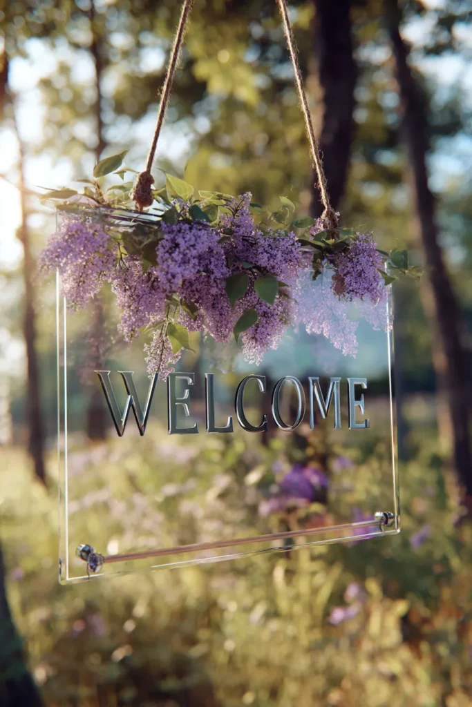 This enchanting welcome sign is a clear acrylic panel suspended by rustic twine, hanging from above in an idyllic outdoor setting, perhaps a garden or sun-drenched wooded area. The text “WELCOME” is rendered in bold, sophisticated silver dimensional lettering that casts a shadow on the transparent surface. The top of the sign is beautifully decorated with a thick garland of vibrant purple lilacs and fresh green leaves, which drapes down across the top edge. The backdrop of soft-focus greenery and the dappled light filtering through the trees make the lilac color pop perfectly.