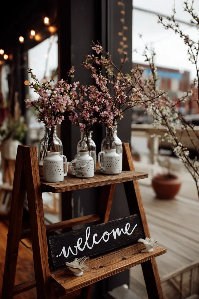 This creative welcome sign idea uses a multi-tiered wooden shelf in a warm, rustic stain to create a full decor moment. The top shelf holds several glass bottles filled with beautiful pink cherry or apple blossoms, which truly capture the essence of spring. These are flanked by cute white ceramic pitchers with a speckled design, adding a charming farmhouse feel. On the bottom shelf, a small, dark wooden plank sign says “welcome” in a white script, framed by little white ceramic bird figurines for an extra sweet touch.