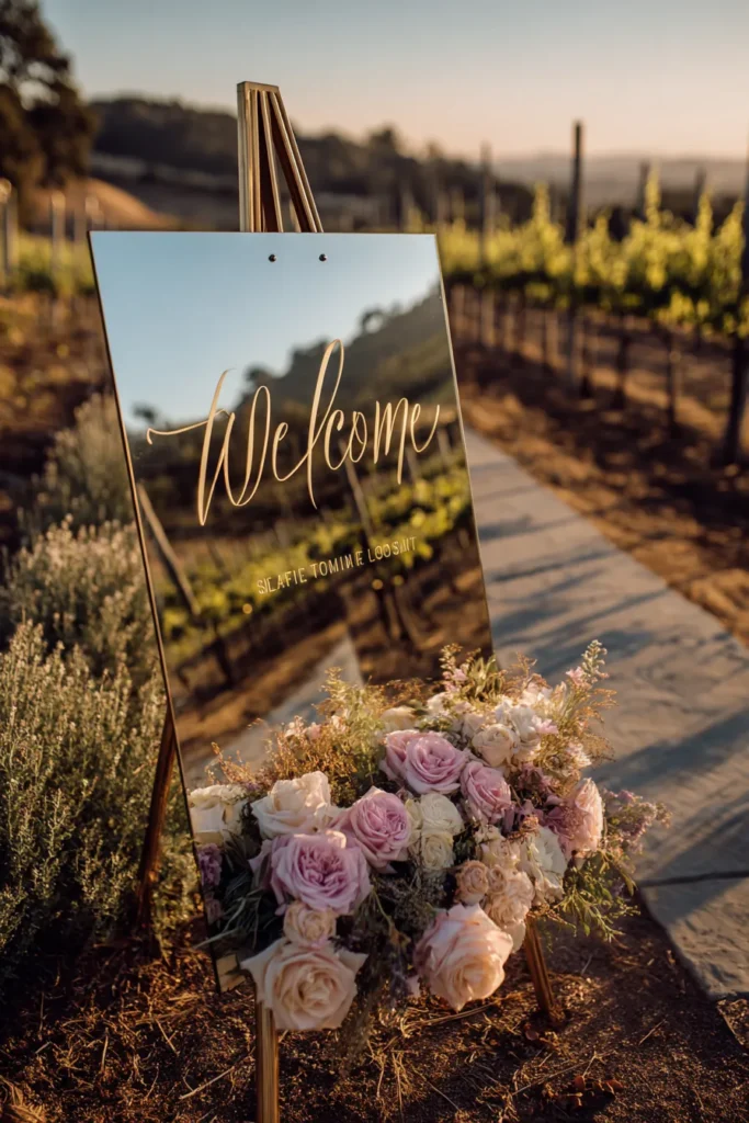 I am completely blown away by the elegance of this sign; it is pure luxury and so incredibly chic for a vineyard or upscale outdoor wedding. The mirrored surface is genius because it pulls the beauty of the surrounding landscape, like those rolling hills and grapevines, right into the decor in the most seamless way. The abundance of those soft, pastel garden roses is a spring dream come true, giving it a feminine and timeless feel that perfectly balances the modern, clean lines of the mirror and gold easel. It is truly a statement piece that will make your guests feel like they have arrived at the most exclusive and beautiful celebration.
