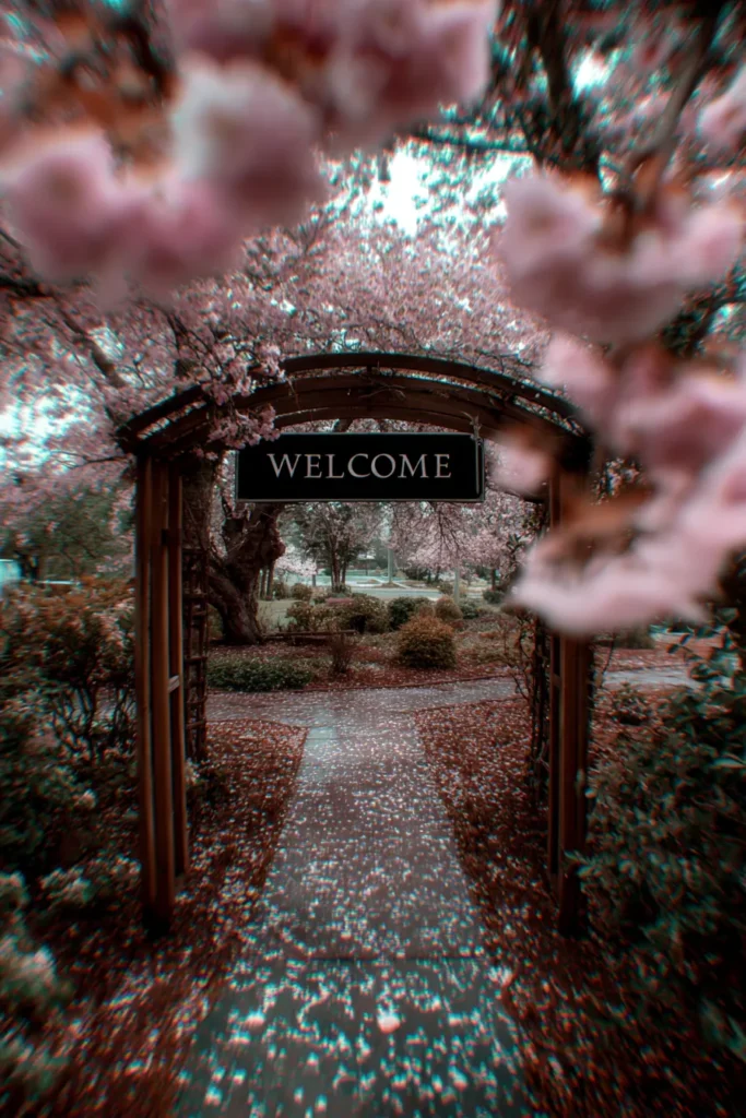 This picture-perfect scene features a simple, dark wooden archway, perhaps marking the entrance to a beautiful park or garden. A sleek, horizontal black sign with the word “WELCOME” in bold white capital letters is suspended from the top beam of the arch. The whole area is enveloped in the ethereal beauty of blooming cherry blossom trees, with soft pink petals creating a gorgeous frame in the foreground and carpeting the ground along the stone pathway. The path leads the eye through the arch and into the serene, lush green garden beyond.