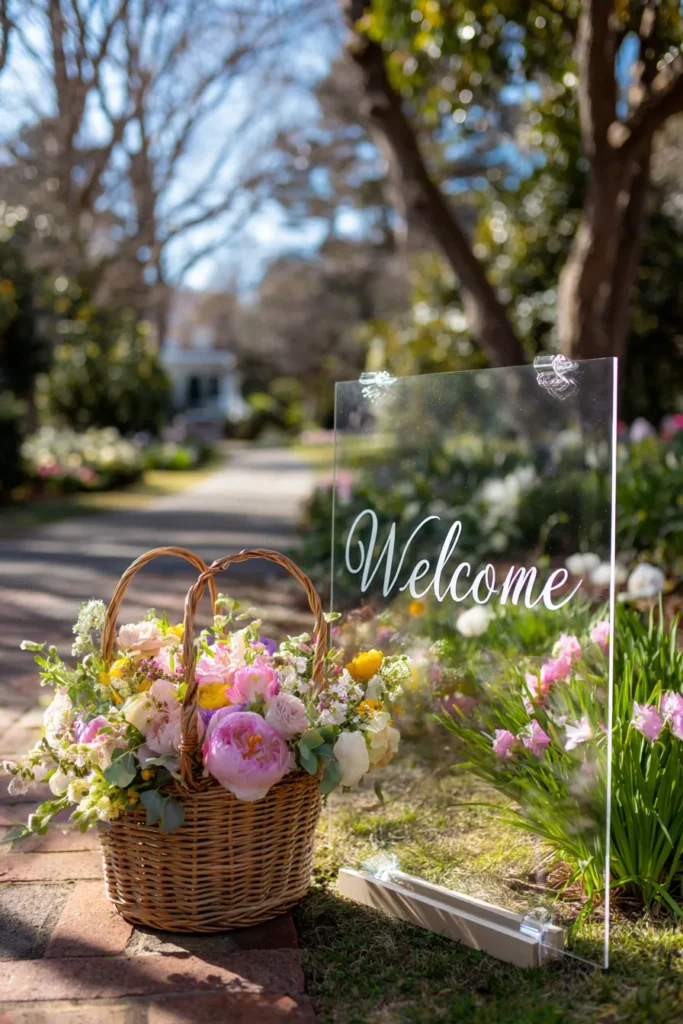 This setup is the absolute epitome of a joyful, colorful spring wedding, and I am completely in love with it. The clean, modern look of the acrylic sign is beautifully contrasted with the traditional, bountiful flower basket, giving the display a truly unique and balanced aesthetic. The flowers are just a burst of pure happiness, full of all the best colors of the season. It feels like such a sweet and whimsical way to welcome guests, like inviting them to an elegant garden party that is completely drenched in sunshine and fresh blooms.