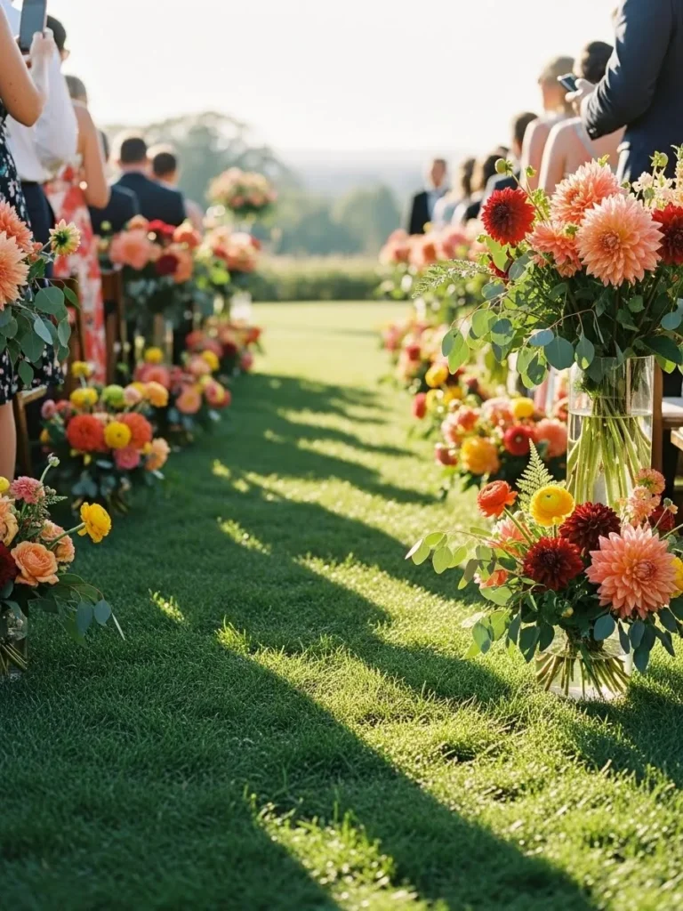 Tall floral arrangements line both sides of a grassy ceremony aisle, overflowing with coral, peach, soft pink, and creamy blooms. The flowers sit low and full, mixed with fresh greenery that spills outward and catches the sunlight. The setting feels open and natural, with guests seated nearby and long shadows stretching across the lawn.