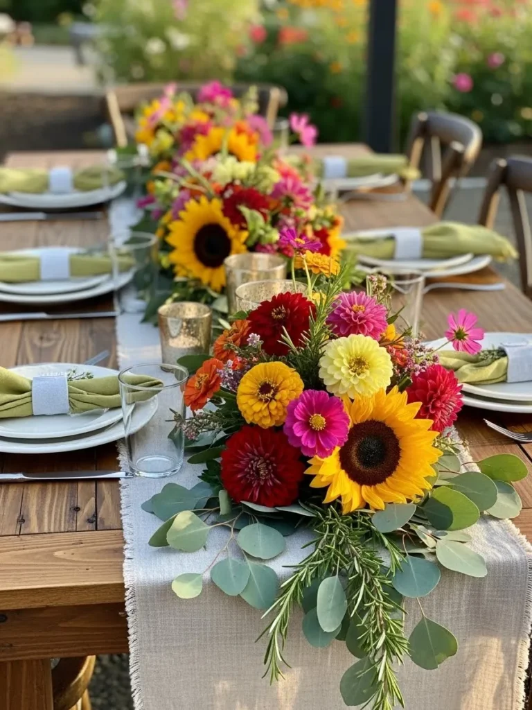 A long wooden table is decorated with a colorful floral runner featuring sunflowers, red and pink blooms, and eucalyptus leaves. The flowers are placed generously down the center, paired with neutral table settings that let the colors shine. Everything feels relaxed and inviting.