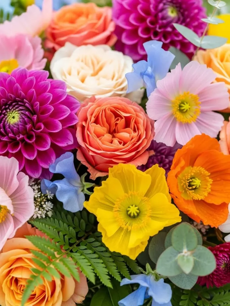 A close view of vibrant summer flowers shows coral roses, pink dahlias, yellow ranunculus, and soft blue accents nestled together. The colors feel bold yet balanced, with greenery tucked in for contrast. Every petal feels fresh and full of life.