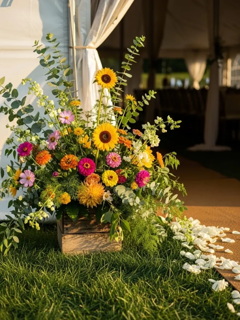 A lush floral arrangement sits at the entrance of a wedding tent, bursting with sunflowers, pink blooms, and fresh greenery. The flowers spill outward from a rustic container, creating a cheerful and welcoming look. Soft fabric drapes and green grass frame the scene beautifully.