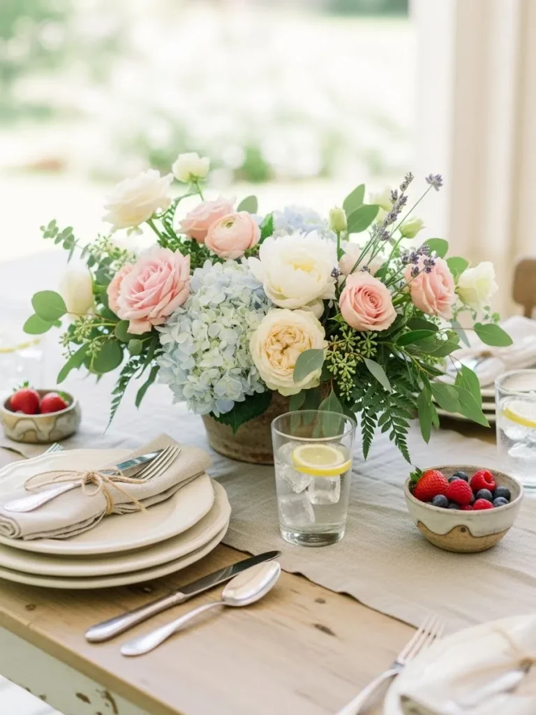 A compact floral arrangement rests at the center of a wooden table, featuring blush roses, white blooms, and soft greenery. Simple place settings and natural light keep the look clean and inviting. The flowers add just enough romance without overwhelming the table.