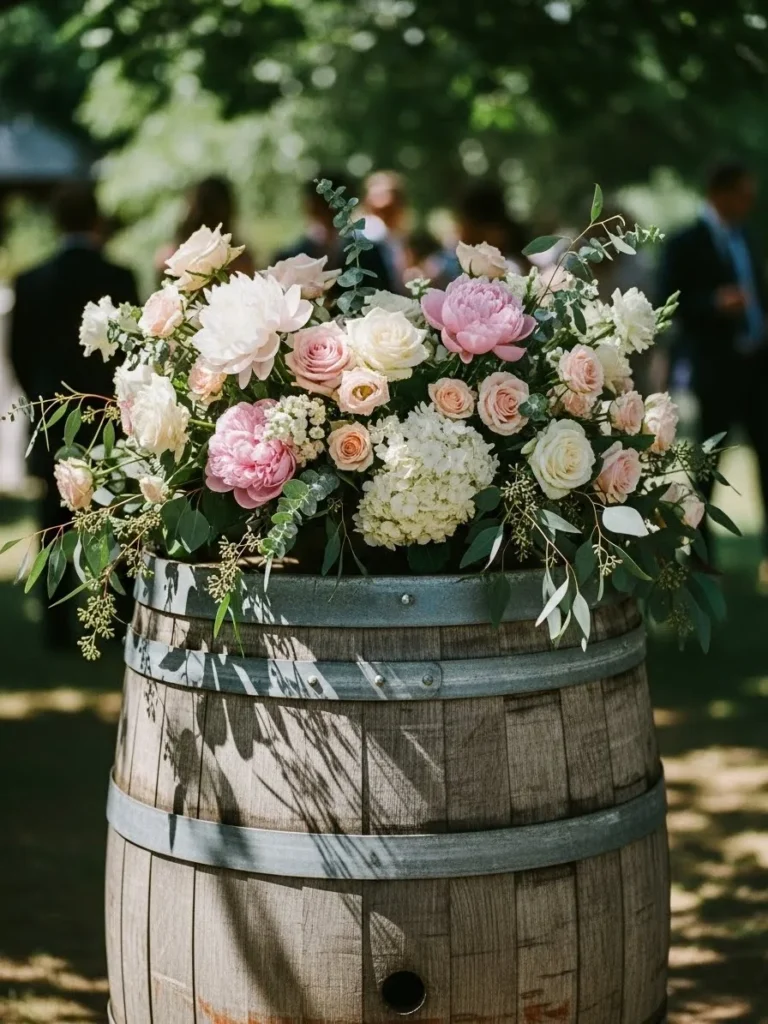 This design feels incredibly cozy to me. I love how the barrel adds character while the flowers keep it romantic. It is the kind of detail that feels relaxed but still very intentional.