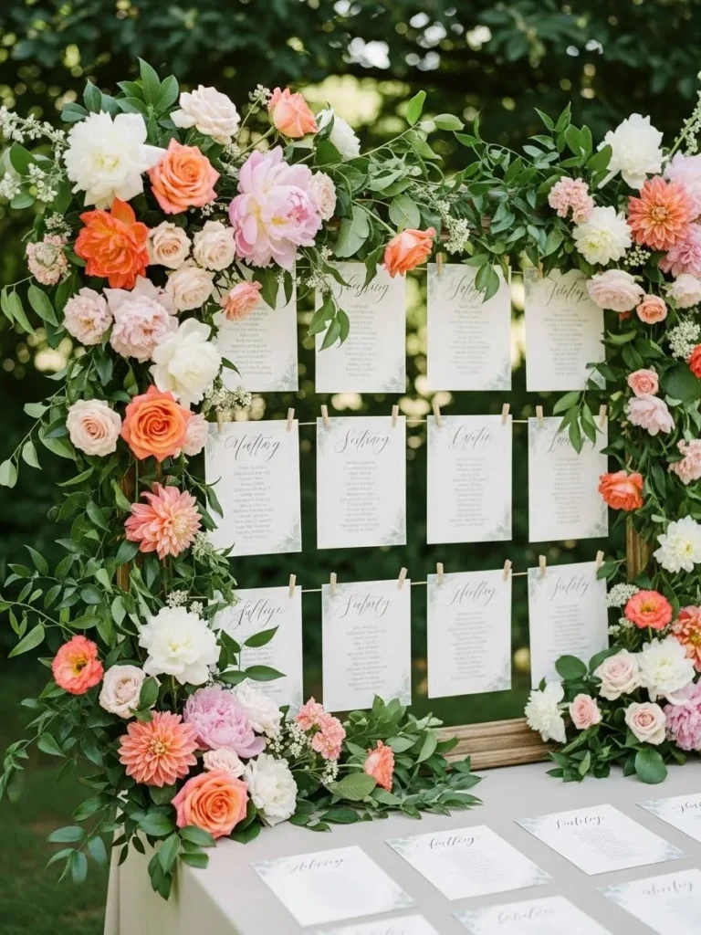 A large escort card display is framed with lush florals in soft peach, blush, and white tones. Greenery weaves throughout the design, softening the structure and adding movement. The cards sit neatly within the floral frame, creating both beauty and function.