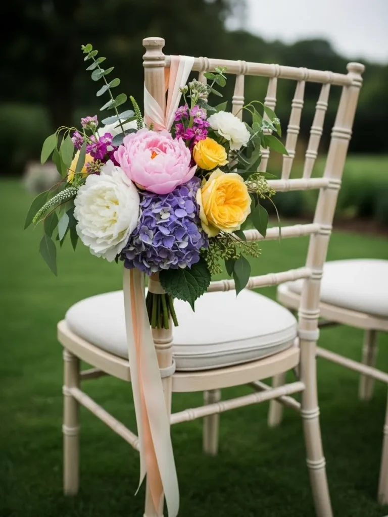 A single floral arrangement is tied to a wooden chair, featuring pastel blooms in pink, yellow, and soft purple with flowing greenery. A trailing ribbon adds a gentle finishing touch. The chair sits on a grassy lawn, keeping the look natural and light.