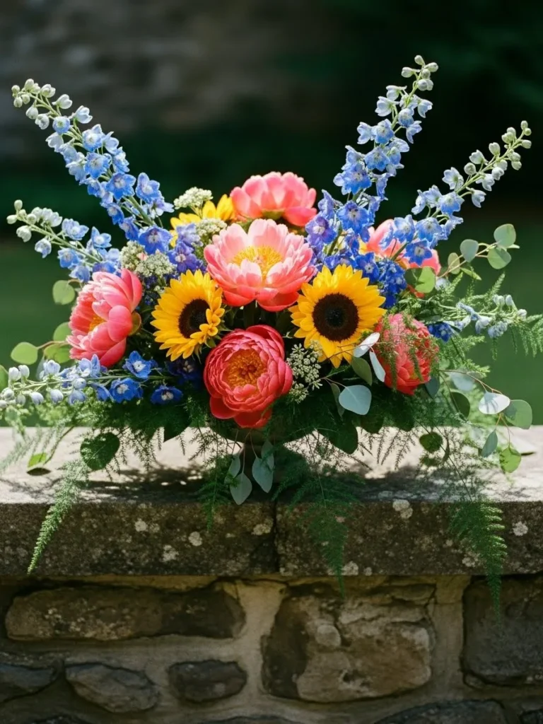 A vibrant floral arrangement rests on a rustic stone wall, filled with coral roses, yellow sunflowers, pink blooms, and tall blue accents rising upward. The flowers feel full and freshly gathered, with greenery spilling naturally around the base. The stone texture adds contrast and gives the colors even more impact.