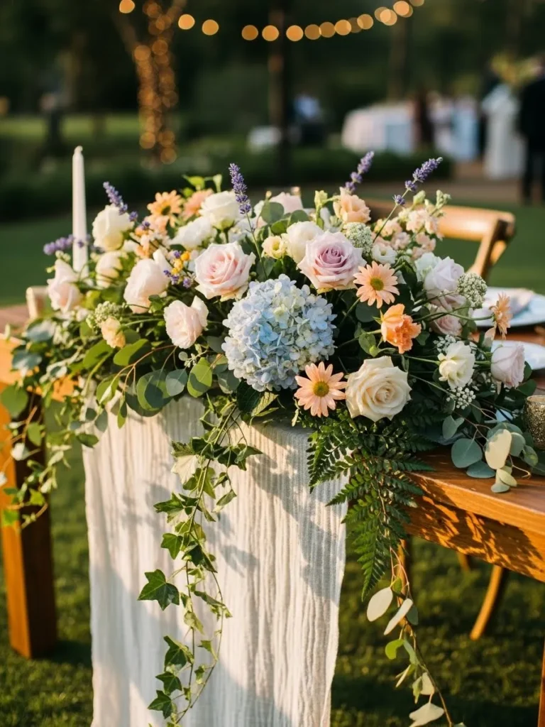 A wooden sweetheart table is dressed with soft white fabric and topped with a lush floral arrangement in pale pinks, creams, and soft greens. Candles and trailing greenery add movement, while warm string lights glow softly in the background. Everything feels intimate and thoughtfully styled.