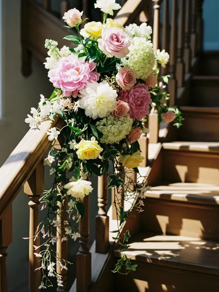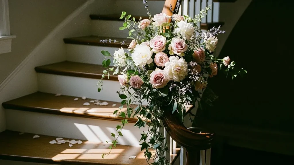 A cascading floral garland flows along a staircase railing, featuring soft pink roses, white blooms, and trailing greenery. The flowers follow the lines of the steps, creating a gentle sense of movement. Light spills across the scene, highlighting the textures and petals.