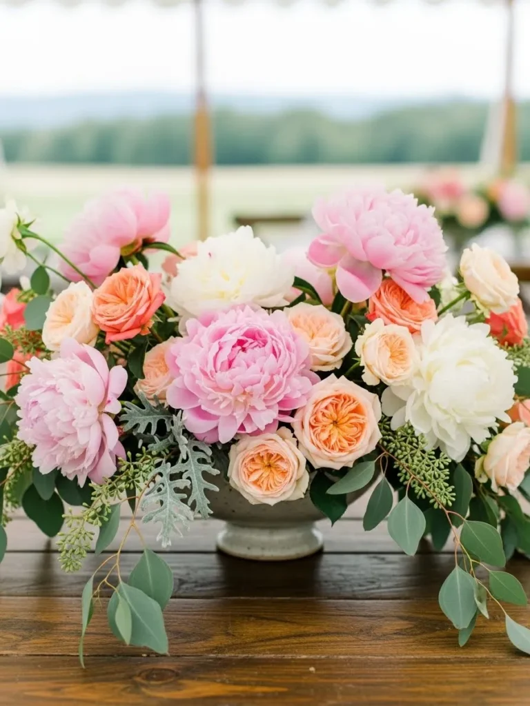 A low floral arrangement sits on a wooden table, filled with blush peonies, soft pink roses, cream blooms, and eucalyptus leaves. The colors feel calm and romantic, balanced by the natural wood surface beneath. Everything looks polished but still relaxed.