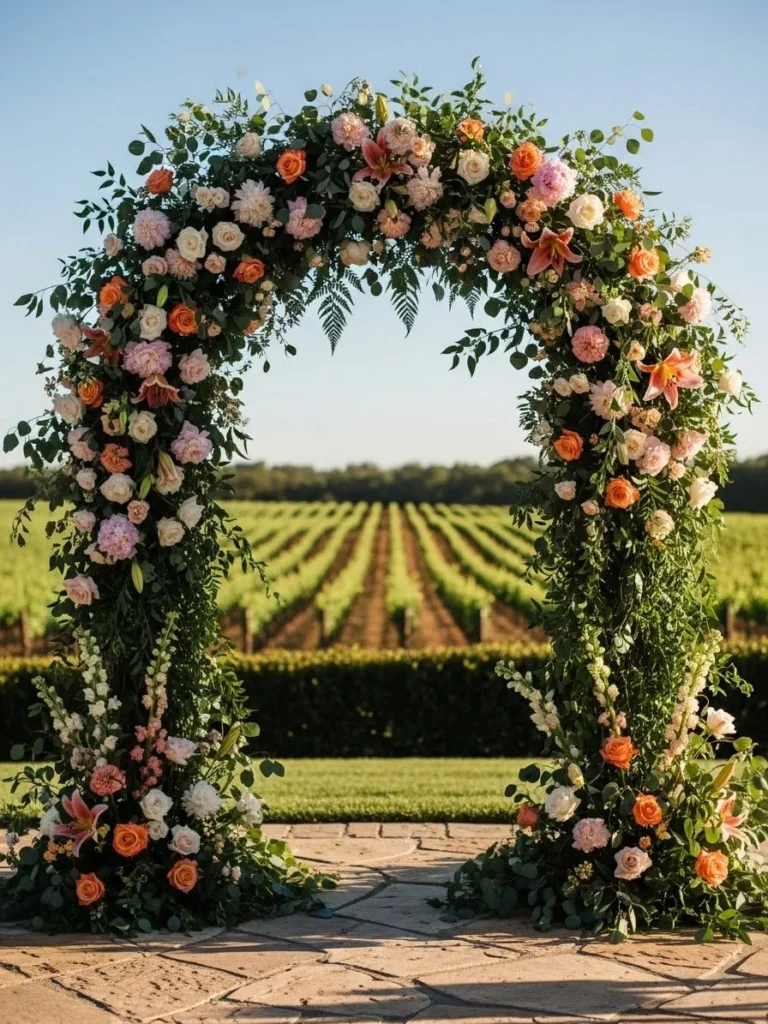 A full floral arch frames a scenic vineyard backdrop, layered with blush roses, peach blooms, and trailing greenery. The flowers are arranged generously, creating a rounded shape that feels balanced and organic. Rows of grapevines stretch into the distance behind it.