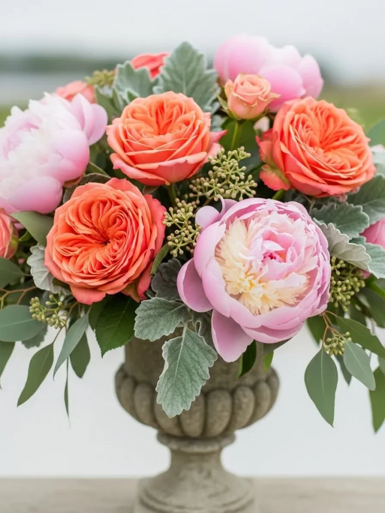 A stone urn holds a lush bouquet of blush, cream, and soft coral roses mixed with greenery. The blooms are full and layered, creating a timeless garden look. Sunlight highlights the petals and adds depth to the arrangement.