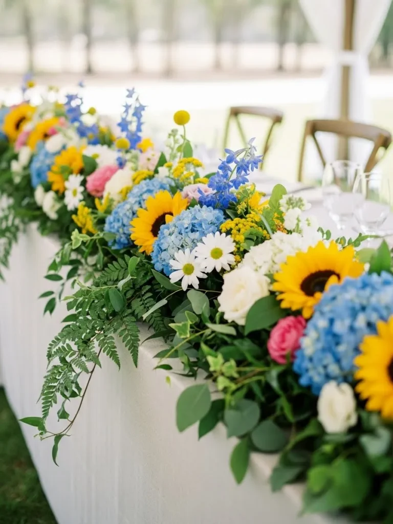 A long table is dressed with vibrant floral arrangements featuring sunflowers, daisies, blue accents, and lush greenery. The flowers run along the length of the table, creating a continuous burst of color. Natural light and simple chairs keep the look fresh and relaxed.