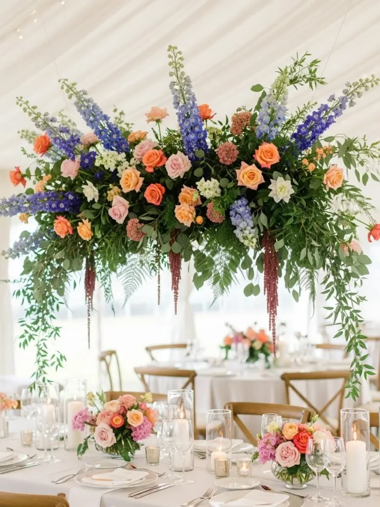 I love how this kind of statement piece instantly makes the space feel special. It draws the eye upward and creates that wow moment without feeling heavy. To me, it feels romantic and joyful, like the flowers are floating above the celebration.