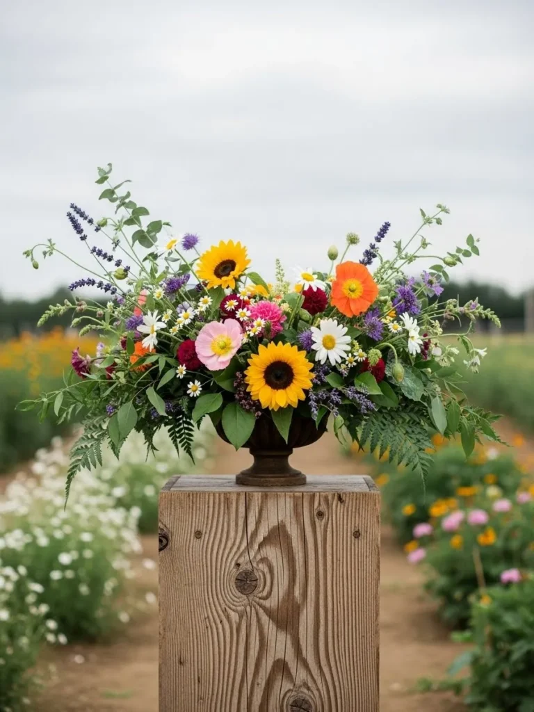 A cheerful mix of sunflowers, pink and purple blooms, and fresh greenery sits atop a rustic wooden pedestal. The flowers feel loose and natural, almost as if they were just gathered from a nearby field. The open landscape behind it adds to the relaxed summer vibe.