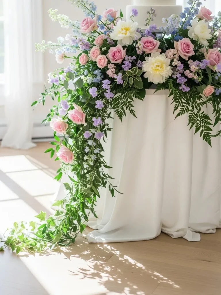 Soft pink and white blooms spill gracefully over the edge of a ceremony table, paired with flowing greenery that drapes down toward the floor. The arrangement feels full yet gentle, with petals and leaves creating movement. Light fabric behind the table keeps the look airy and elegant.