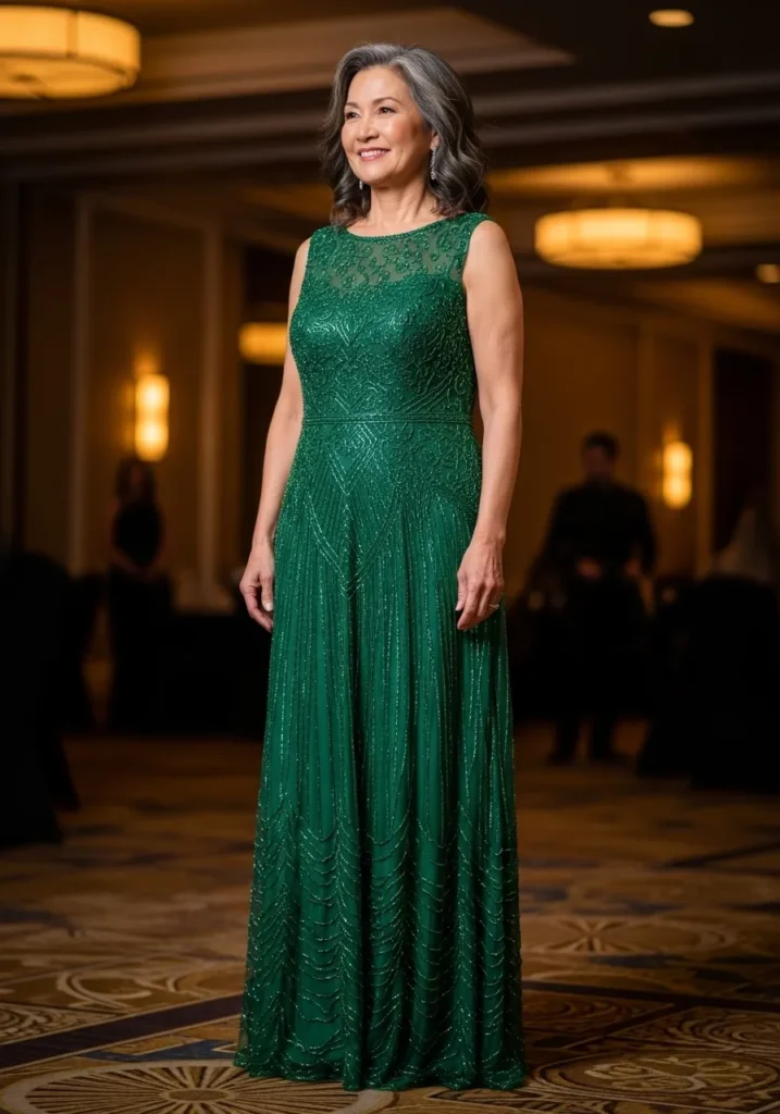 Sleeveless Emerald Beaded Gown with Timeless Refinement