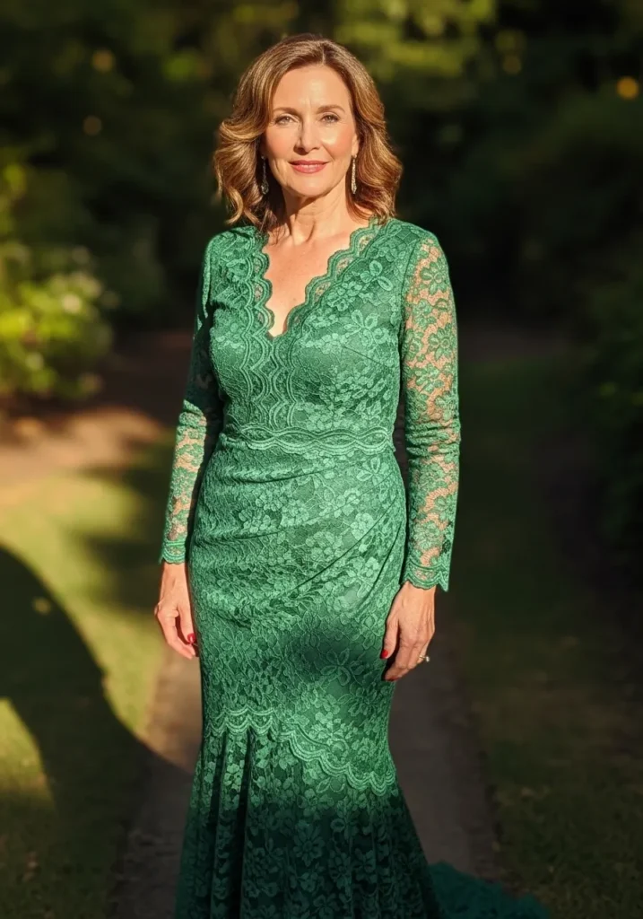 This emerald lace gown features intricate floral detailing, a softly fitted silhouette, and sheer sleeves that add delicate texture. The structured shape and elegant fabric make it ideal for formal indoor venues with grand architectural backdrops.