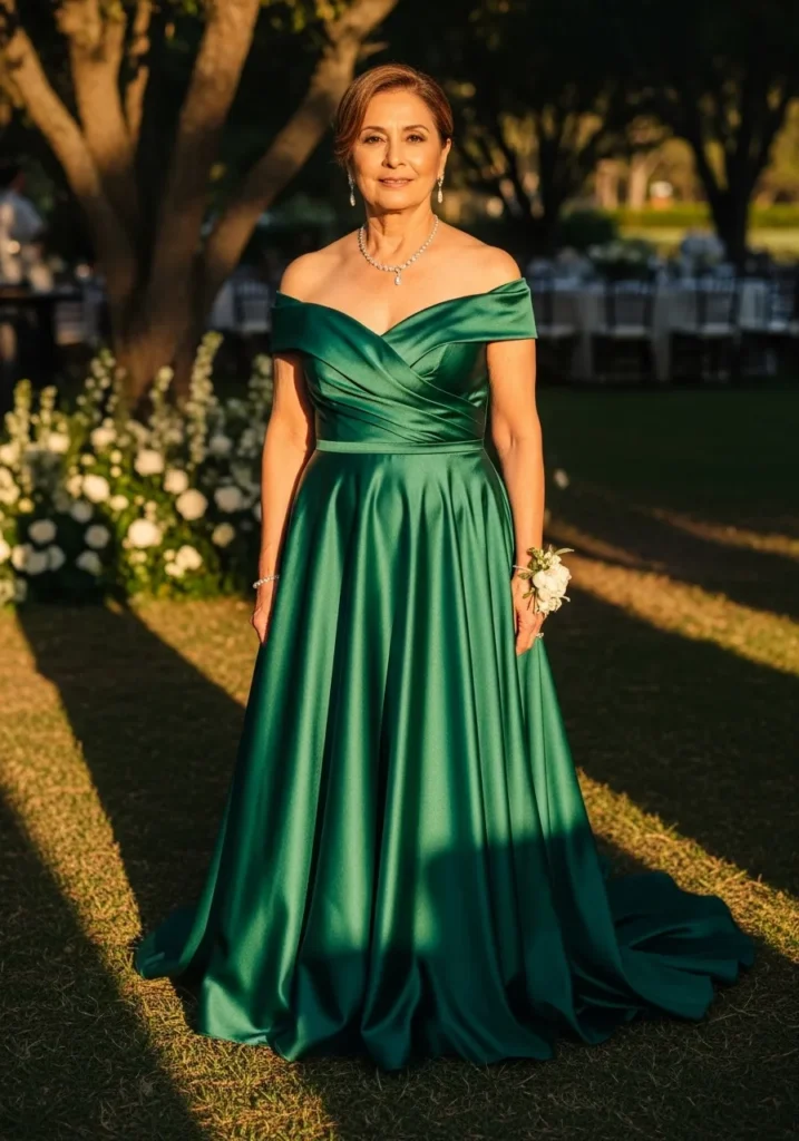 This emerald satin gown features an off-shoulder neckline, softly structured bodice, and a flowing skirt that reflects warm golden light beautifully. The smooth fabric creates gentle highlights and shadows, giving the entire look a luxurious and romantic feel, especially in outdoor evening settings.
