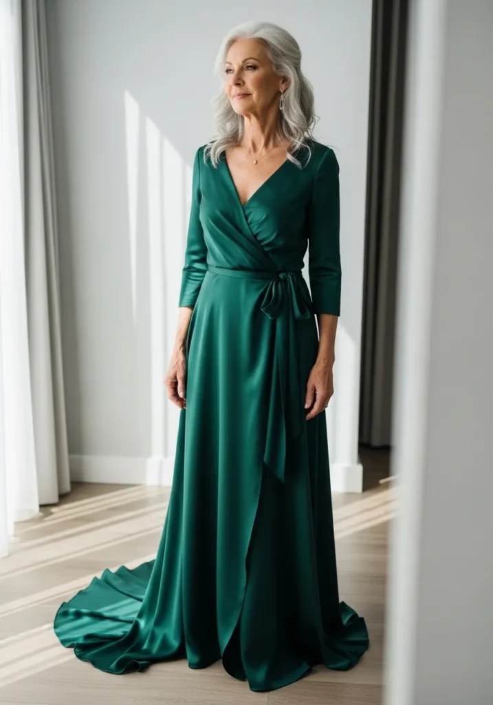 This emerald green wrap-style gown features a flattering V neckline, softly draped waist, and a flowing floor-length skirt that moves beautifully with each step. The smooth fabric catches the natural window light perfectly, highlighting gentle folds and subtle sheen while keeping the overall look polished and refined.