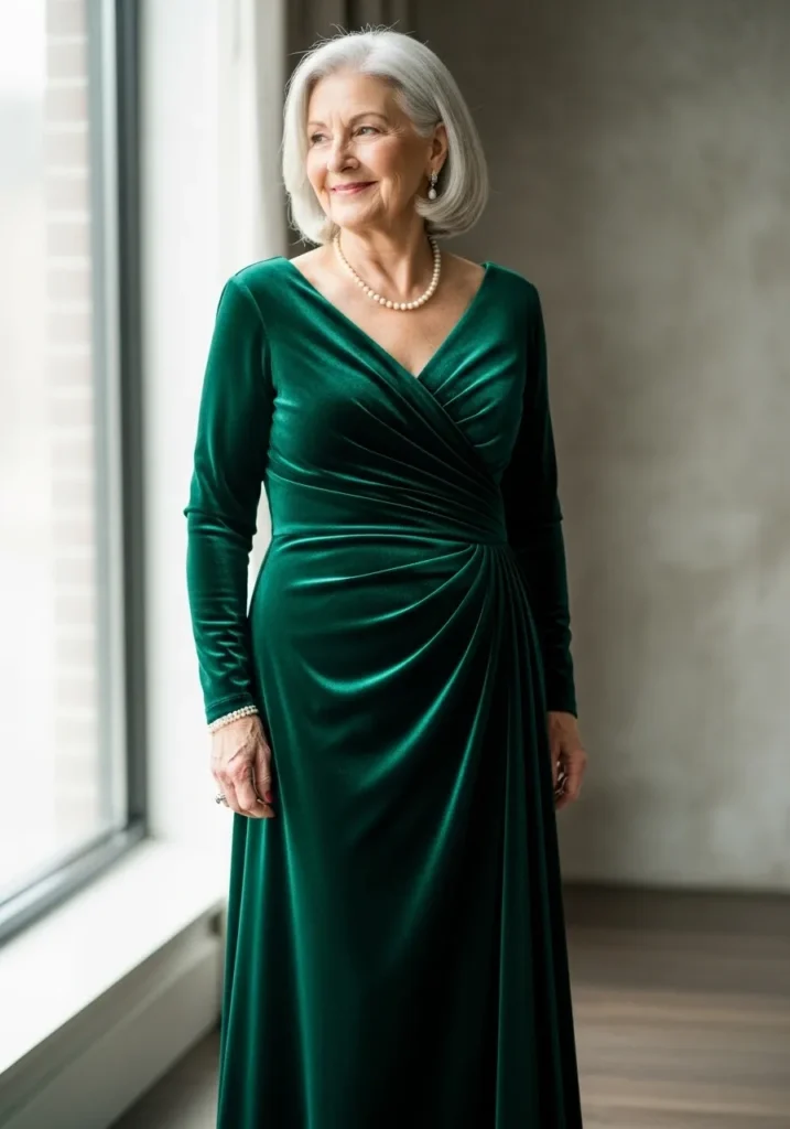 Elegant Emerald Wrap Gown with Soft Window Light