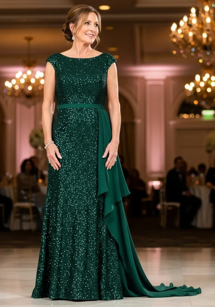 I absolutely love how refined and confident this look feels. The sequins bring just the right amount of sparkle without overwhelming the design, and the side drape adds a graceful softness that balances everything beautifully. It feels like the kind of gown that makes a mother of the bride feel instantly radiant, elegant, and completely ready for a grand celebration.
