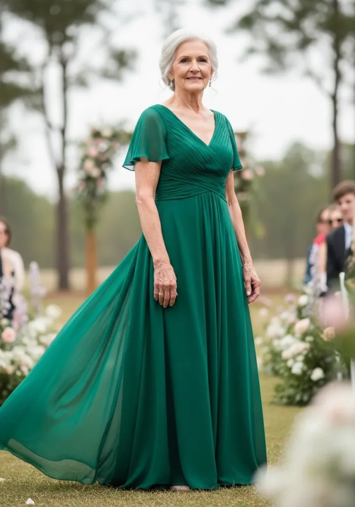 This emerald chiffon gown features a softly draped bodice, flutter sleeves, and a sweeping skirt that flows gracefully across the floor. The lightweight fabric creates beautiful motion, especially when caught by a gentle breeze in an outdoor setting.