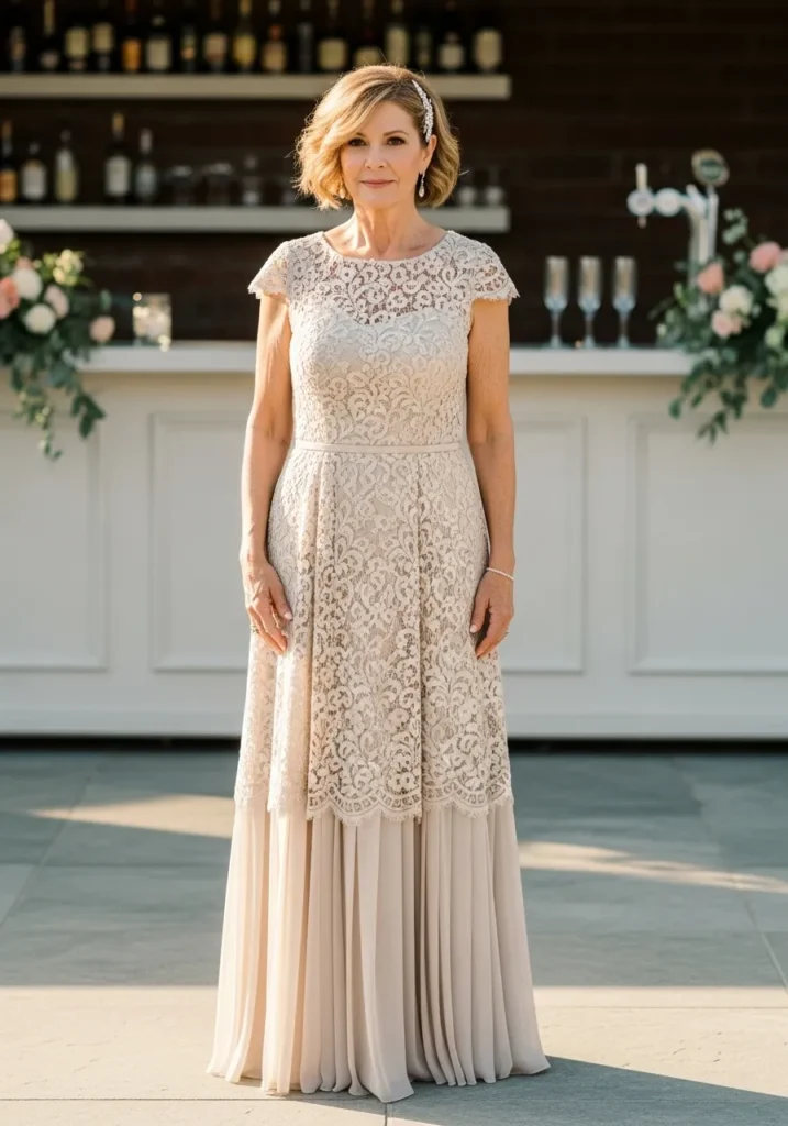 This look features a beautiful champagne-toned lace gown with a delicate illusion neckline, short lace sleeves, and a softly pleated chiffon skirt that flows effortlessly to the floor. The intricate lace pattern adds depth and texture, while the neutral tone keeps everything timeless and refined, making it perfect for an upscale spring wedding setting.
