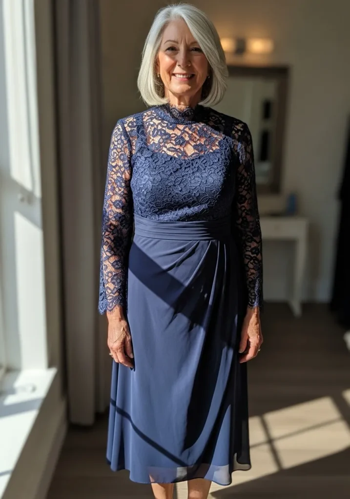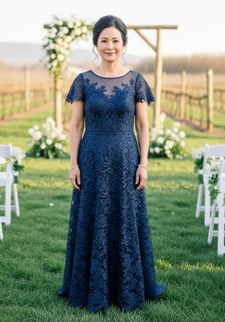 This refined navy gown features a lace overlay on the bodice and sleeves, balanced with a softly draped skirt that adds graceful movement. The rich deep tone creates a striking contrast, while the tailored fit keeps the entire look polished and elegant.