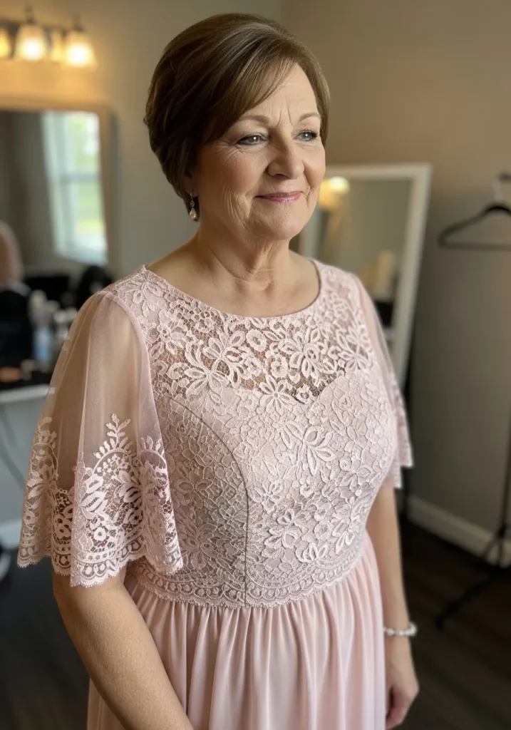 This delicate blush dress features a lace bodice with short sleeves and a gently flowing skirt that feels light and romantic. The soft pastel hue and intricate lace textures give it a sweet yet refined charm.