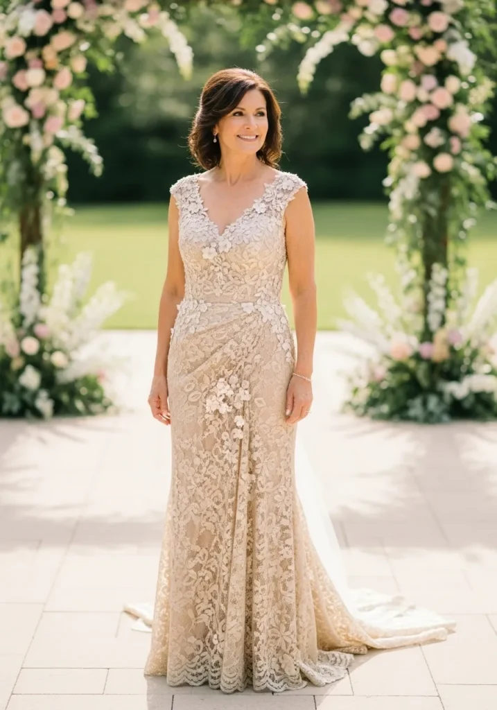 This elegant champagne gown highlights detailed lace patterns across the bodice and skirt, flowing into a subtle train that adds a hint of drama. The fitted silhouette and soft color palette create a beautifully balanced look for formal ceremonies.