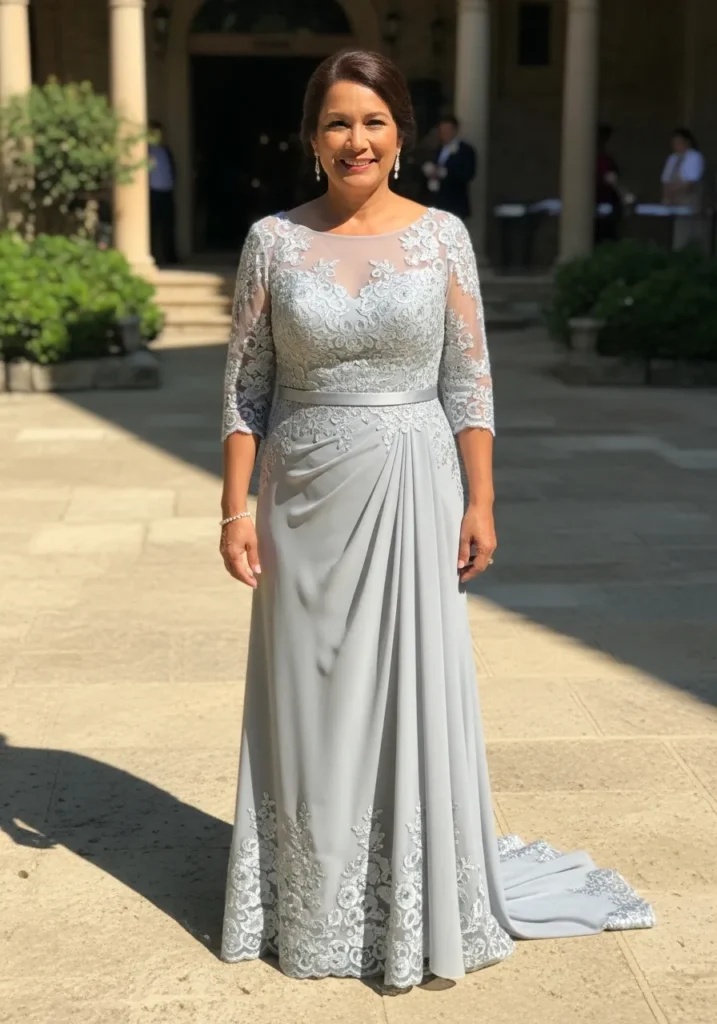 This refined silver gray gown showcases intricate lace across the bodice and sleeves, flowing into a soft, draped skirt with gentle pleating and a subtle train. The soft sheen of the fabric catches the light beautifully, creating a polished and sophisticated finish.