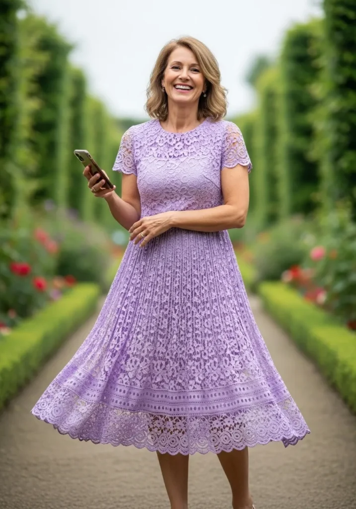 This sweet lavender tea length dress features delicate lace layering, short sleeves, and a softly flared skirt that moves gracefully. The pastel shade feels light and cheerful, while the lace texture adds a lovely touch of romance.