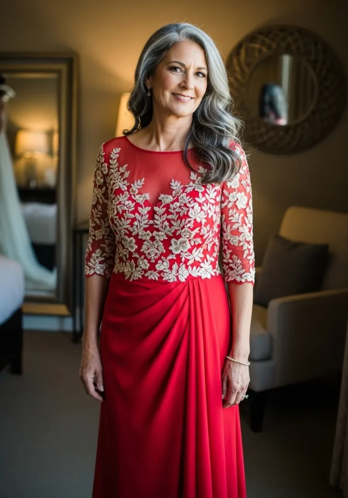 I adore how confident and glamorous this look feels, especially for evening celebrations. It’s bold, beautiful, and perfect for mothers who love making a stylish statement while still staying wedding appropriate.