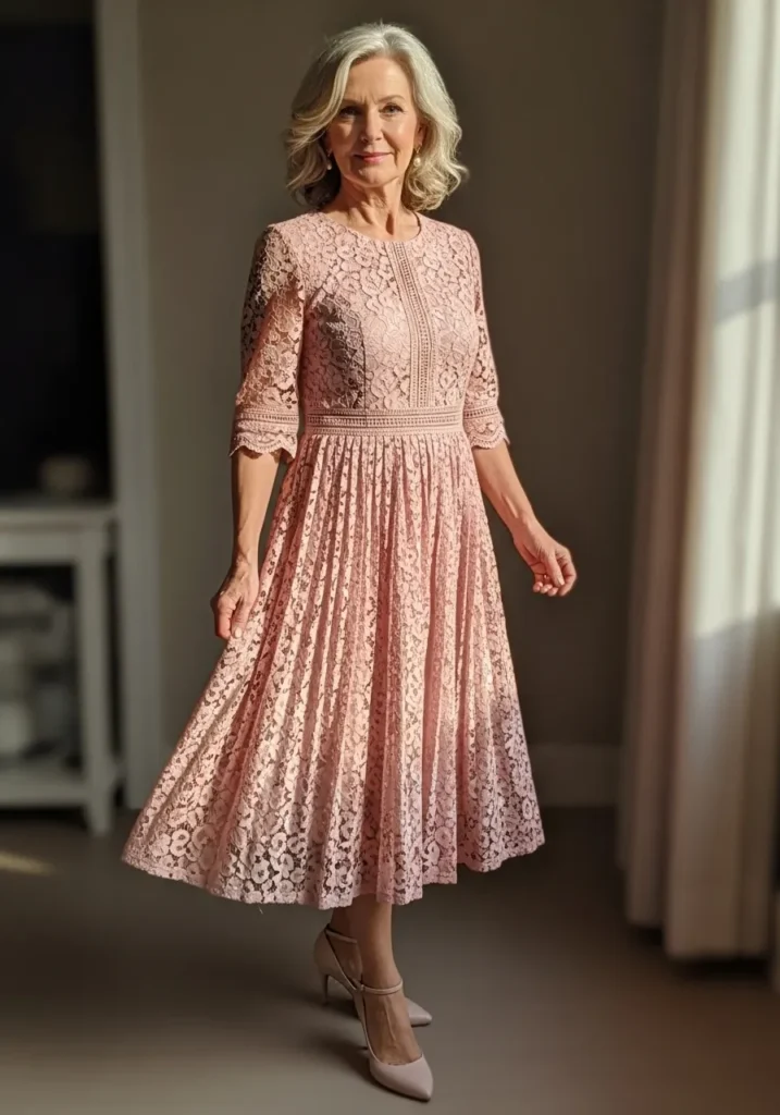 Soft Blush Lace Tea Length Dress with Vintage Charm