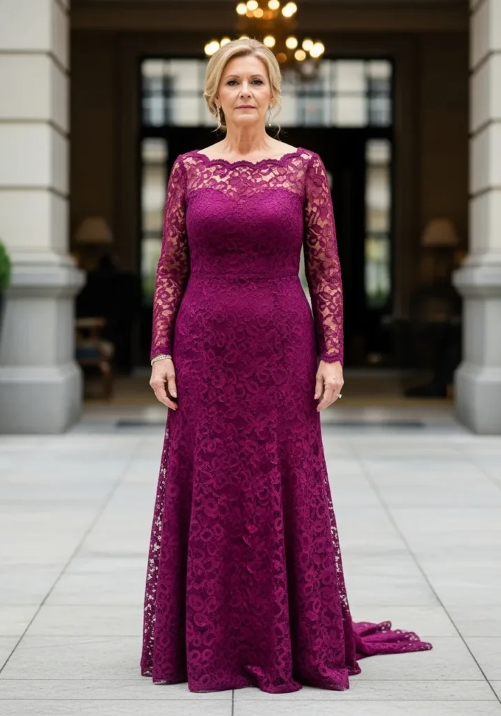 This striking deep berry lace gown showcases a fitted bodice, sheer lace sleeves, and a floor length skirt that creates a bold and glamorous silhouette. The rich color adds depth and drama, while the lace detailing keeps everything elegant and romantic.