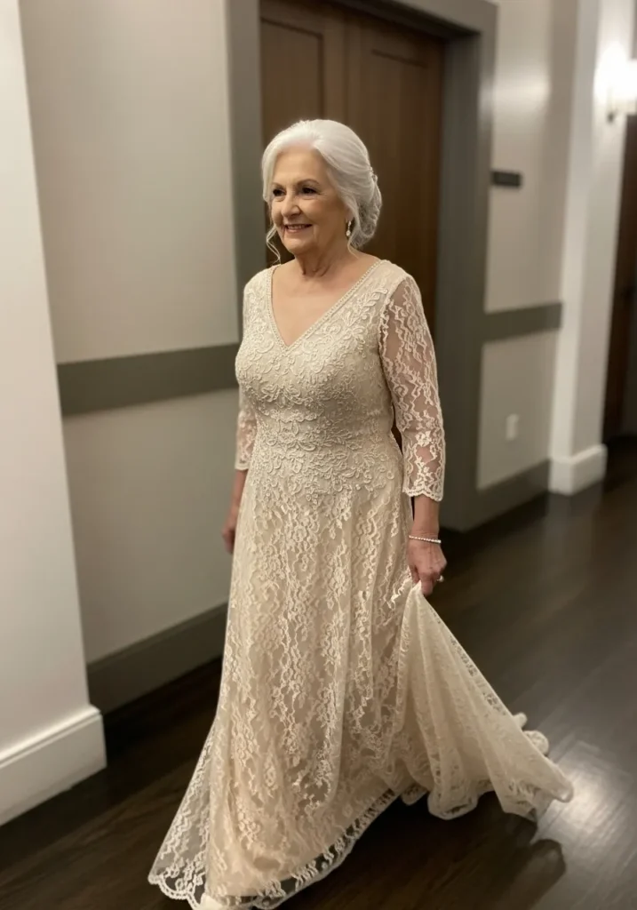 Vintage Inspired Champagne Lace Gown with Classic Grace