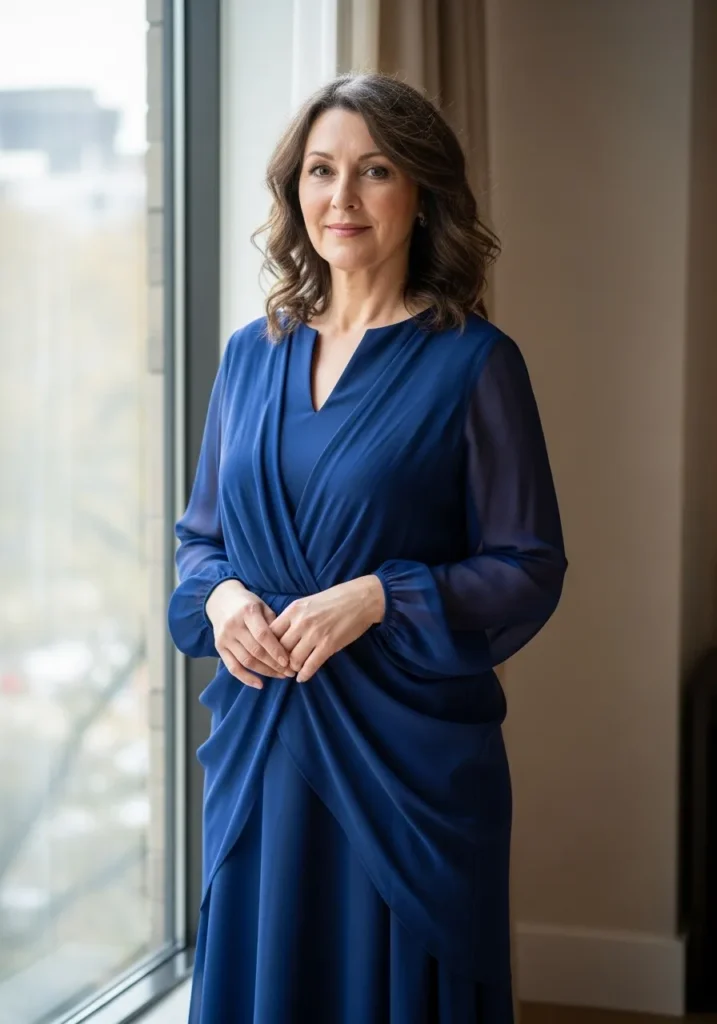 I adore how this style feels both dramatic and wearable at the same time. The movement of the chiffon is so flattering, and the color feels luxurious without being overpowering. It is one of those dresses that makes you feel beautiful the second you put it on.