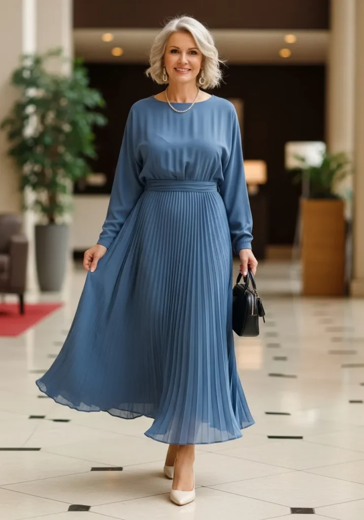 This steel blue midi dress features soft pleats, a gently cinched waist, and relaxed long sleeves that give the outfit a flowing and modern silhouette. The lightweight fabric moves beautifully as you walk, creating a natural sense of elegance. Paired with simple accessories, the look feels effortlessly chic and wearable.
