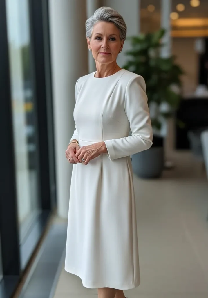 I adore how timeless and fresh this dress feels. The simplicity is what makes it so striking, and it leaves plenty of room to personalize with accessories. It is a beautiful choice for mothers who love a clean, modern aesthetic.