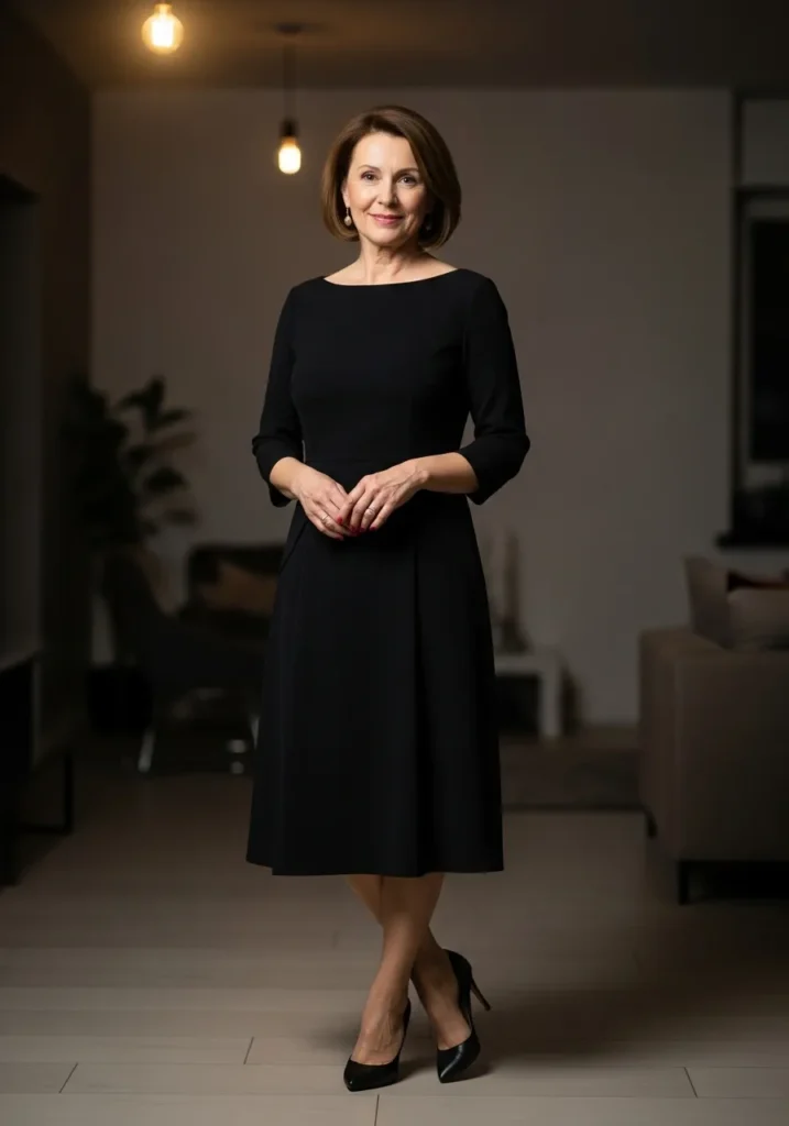 This black midi dress features a streamlined silhouette, modest neckline, and softly flared skirt that adds gentle movement. The fabric has a smooth drape that keeps the look polished and elegant. Simple and understated, this style feels refined and versatile for evening celebrations.
