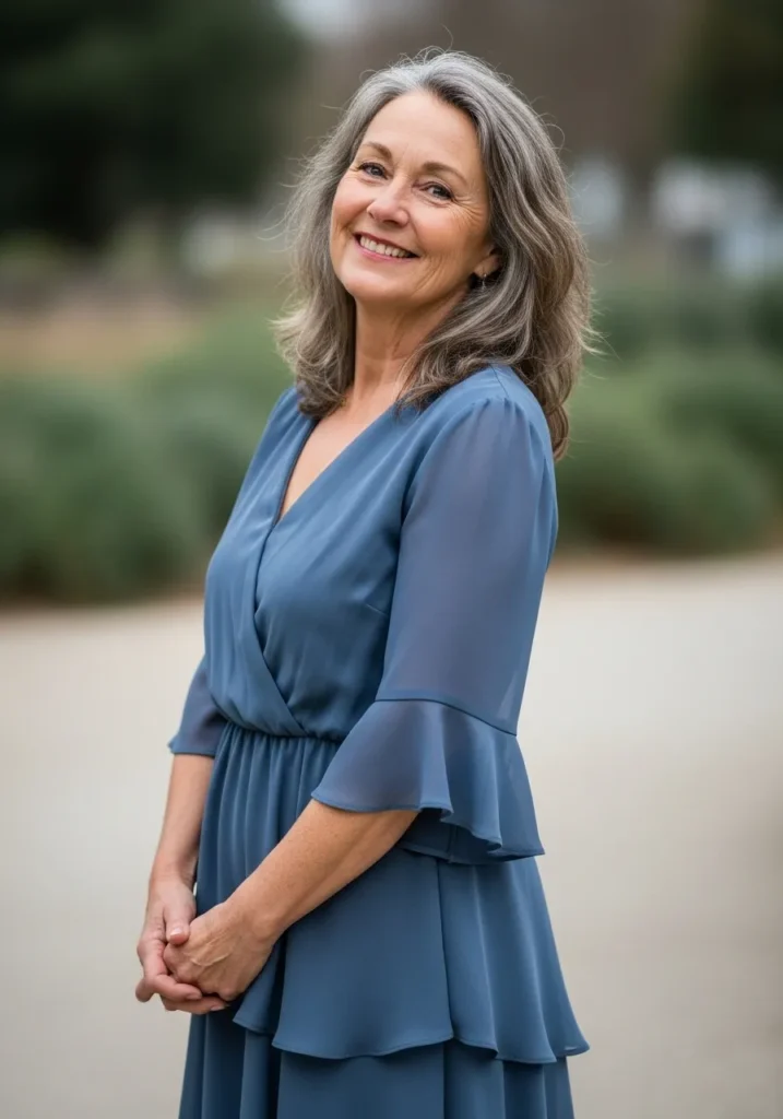 This soft blue chiffon dress features flutter sleeves, a gently cinched waist, and a tiered skirt that creates beautiful movement. The lightweight fabric feels airy and graceful, giving the whole look a soft romantic feel. The muted blue tone keeps it calm, elegant, and fresh.